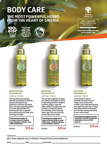 # 401834 100 ml / 3.3 fl ozA rich blend of lavender, Siberian honey clover, rosemary and other natural essential oils and extracts relaxes your senses and soothes your body when gently massaged into the skin. A massage with the Relaxing Oil helps to ease away tension and makes you feel the calming sensation.